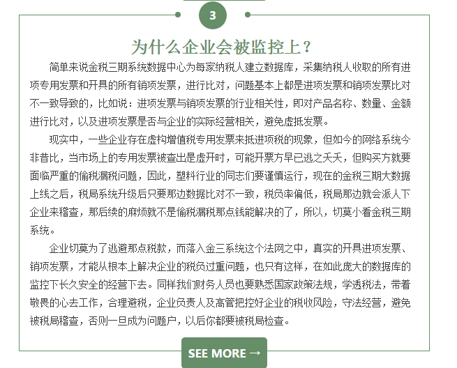 塑料行業(yè)的大家,“金稅三期”上線,偷稅漏稅一旦被盯上,不但可以罰到你破產(chǎn),而且會(huì)直接影響你和子女的終生,企業(yè)的財(cái)務(wù)主管人員也會(huì)被列入黑名單,直接影響未來的工作。那么點(diǎn)事兒,大家可要謹(jǐn)慎為之。