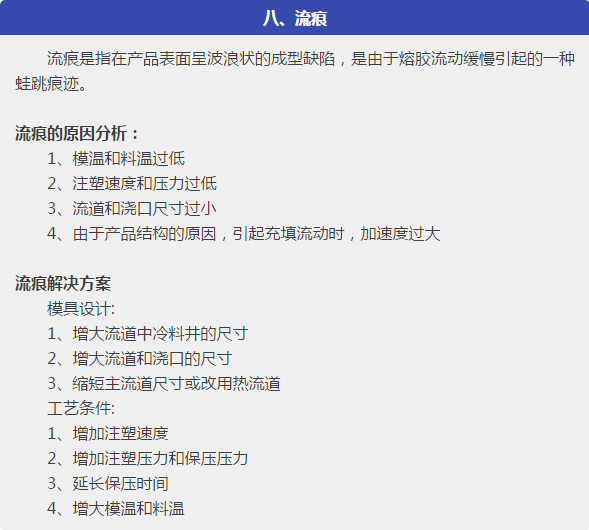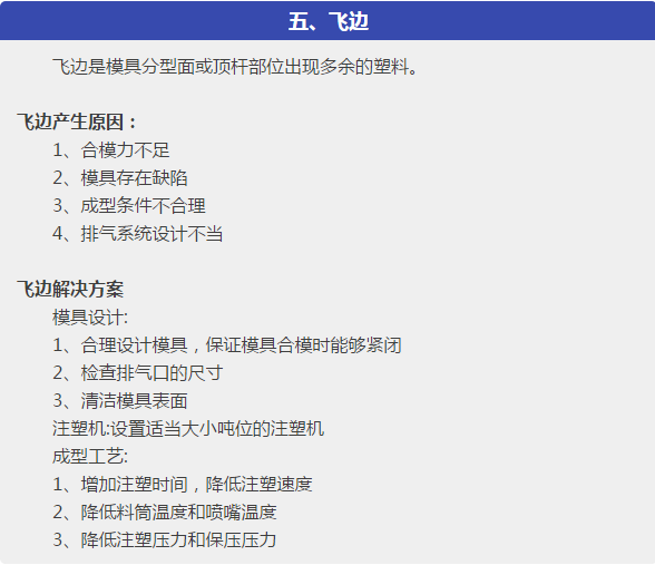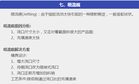 本文針對塑件在成型過程中出現(xiàn)的各種注塑缺陷,主要是:短射,困氣,發(fā)脆,燒焦,飛邊,分層起皮,噴流痕,流痕,霧斑(澆口暈),銀紋(水花紋),凹痕,熔接痕,成型周期過長,翹曲變形,分析了問題產(chǎn)生的可能原因,從原材料、塑件或模具設(shè)計、成型工藝等各方面,提出解決方案。