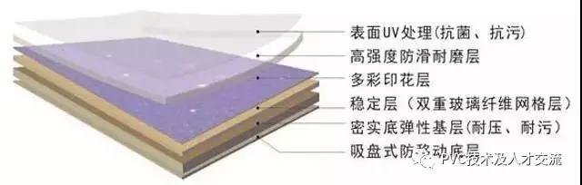 多層復合型PVC地板:有多層結(jié)構(gòu)的地板,一般由4~5層結(jié)構(gòu)疊壓而成,一般有耐磨層(含UV處理)、印花膜層、玻璃纖維層、彈性發(fā)泡層、基層等。