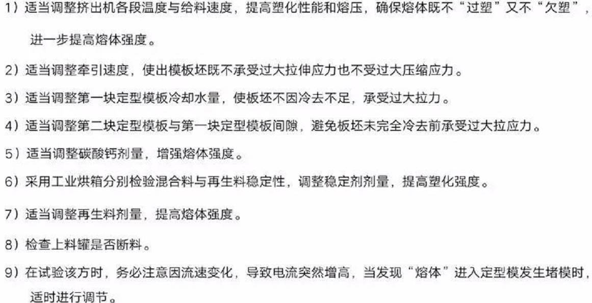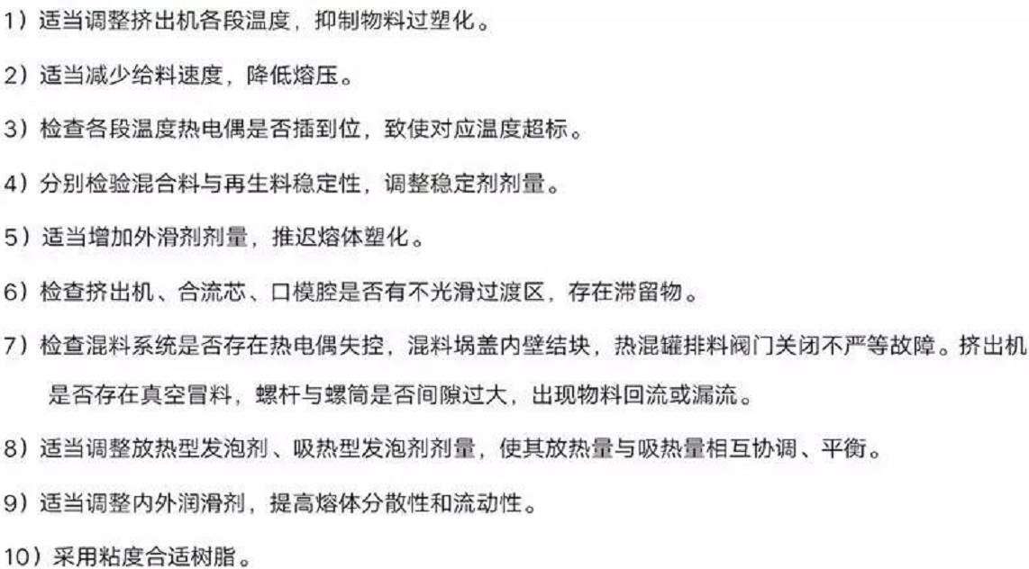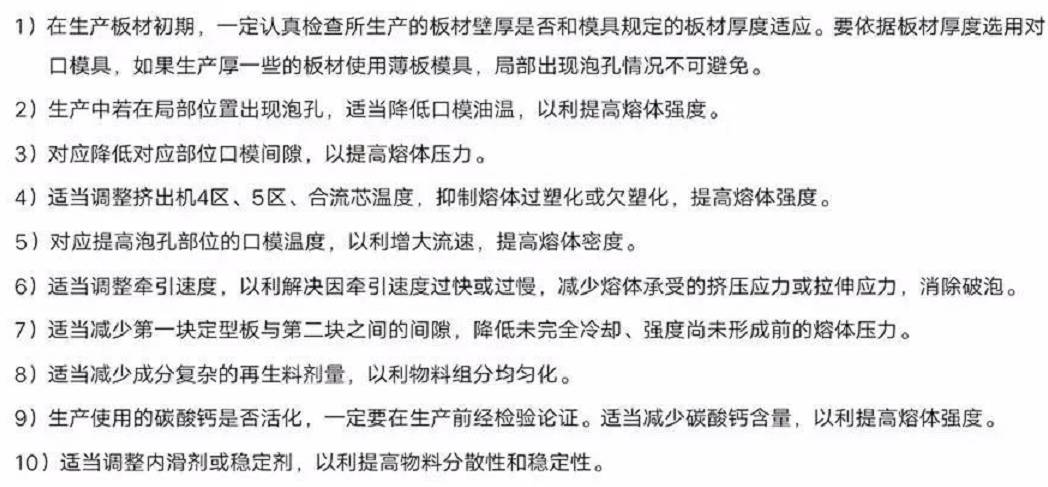 若發(fā)泡制品表面出現(xiàn)大面積泡孔,可適當(dāng)調(diào)整發(fā)泡調(diào)節(jié)劑處理;如在發(fā)泡板表面偶爾出現(xiàn)個別泡孔,很可能和混料未按混料程序、溫度、加料程序辦事,致使混料不均有關(guān),應(yīng)換料處理;如連續(xù)出現(xiàn)圓形泡孔,應(yīng)適當(dāng)調(diào)整黃白發(fā)泡劑劑量;如發(fā)泡板表面時而出現(xiàn)長條泡孔,屬于板面局部密度低的表征,原因比較復(fù)雜,應(yīng)依據(jù)發(fā)生泡孔的時間、部位和概率,從工藝上采取措施處理: