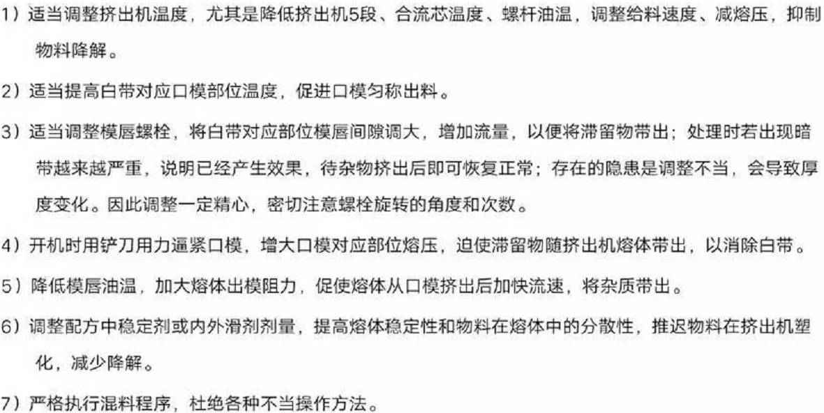 以上七項處理措施中第一、二、七項是事前預(yù)防措施,第三、四、五、六項是應(yīng)時處理措施。當(dāng)開機(jī)時出現(xiàn)白帶,一般都是口模間隙或溫度設(shè)定不當(dāng)造成的,及時處理即可見效;當(dāng)開機(jī)一段時間,發(fā)生白帶,基本上是合流芯、口模腔、擠出機(jī)內(nèi)發(fā)生滯留物造成的,如采用調(diào)整??陂g隙和溫度方法無效,應(yīng)及時停機(jī),千萬不可盲目持續(xù)調(diào)整,以免延工誤時,造成更大浪費(fèi)。停機(jī)后認(rèn)真檢查口模、合流芯中是否黏附滯留物,如未發(fā)現(xiàn)異常,需進(jìn)一步檢查螺筒中是否黏附滯留物并調(diào)整擠出機(jī)軸向與徑向間隙。