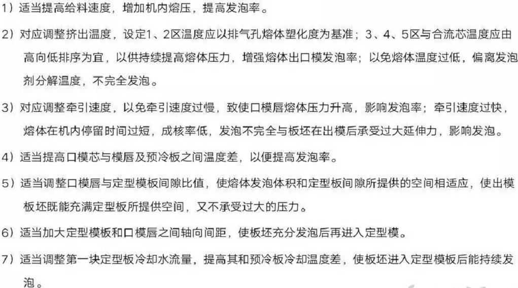調(diào)整時應(yīng)根據(jù)生產(chǎn)所需板材質(zhì)量要求,按照程序由簡到繁,由工藝到配方,由減量到加量進(jìn)行逐項對應(yīng)調(diào)整。值得注意的是:調(diào)整提高發(fā)泡率,降低板材密度時應(yīng)按生產(chǎn)發(fā)泡板的需要各有側(cè)重。以上許多調(diào)整措施,譬如調(diào)整措施4)5)7)8)等都是以犧牲結(jié)皮硬度和光亮度等情況,不可過之而不及,僅僅為降低密度而不考慮結(jié)皮硬度和光亮度。