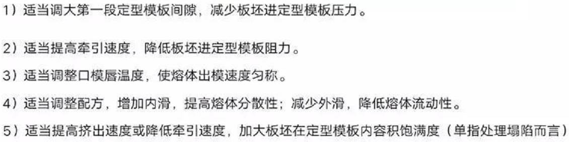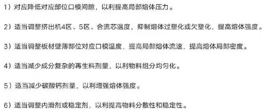 1)口模和白帶對應(yīng)截面間隙設(shè)置偏小,導(dǎo)致流量偏小,熔體從口模擠出時厚度稍微減薄,經(jīng)過定型板時未和定型板接觸摩擦出現(xiàn)的白帶。