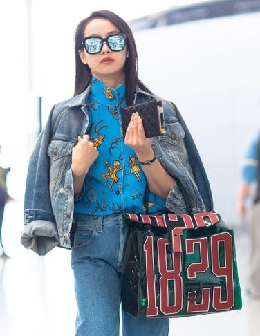 宋茜戴Gentle Monster藍色鏡面墨鏡,身穿藍色破洞牛仔夾克,內(nèi)搭藍色印花雪紡襯衫,手拎Delvaux墨綠色數(shù)字拼貼透明手袋,下穿藍色皮質(zhì)拼接牛仔褲,腳踩Converse白色帆布鞋。純透明的單品會讓部分人覺得過于暴露自己隱私,所以選擇印花透視的PVC既有隱約的神秘感,又可展現(xiàn)時髦感。