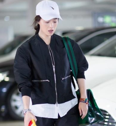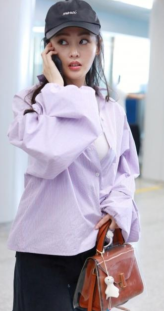 張?zhí)鞇垲^戴黑色字母刺繡棒球帽,身穿淺紫色oversized豎條紋長袖襯衫,內(nèi)搭白色背心,手拎棕色外套透明pvc保護膜Valextra手拎包,下穿Re/done黑色毛邊牛仔半裙,腳踩Hogan古銅色漆皮休閑系帶運動鞋。